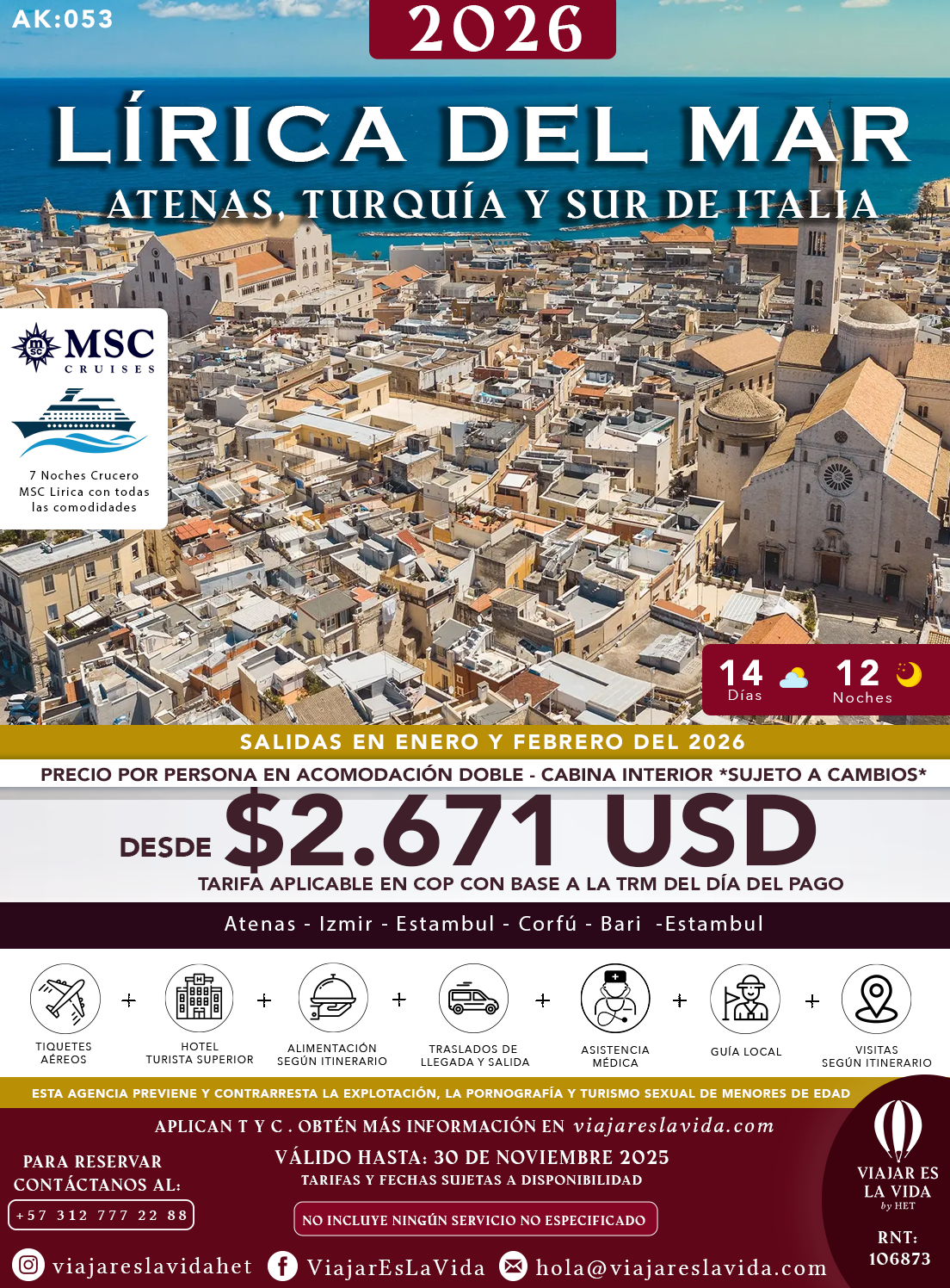 LÍRICA DEL MAR: ATENAS, TURQUÍA Y SUR DE ITALIA CON CRUCERO 2026 AK053