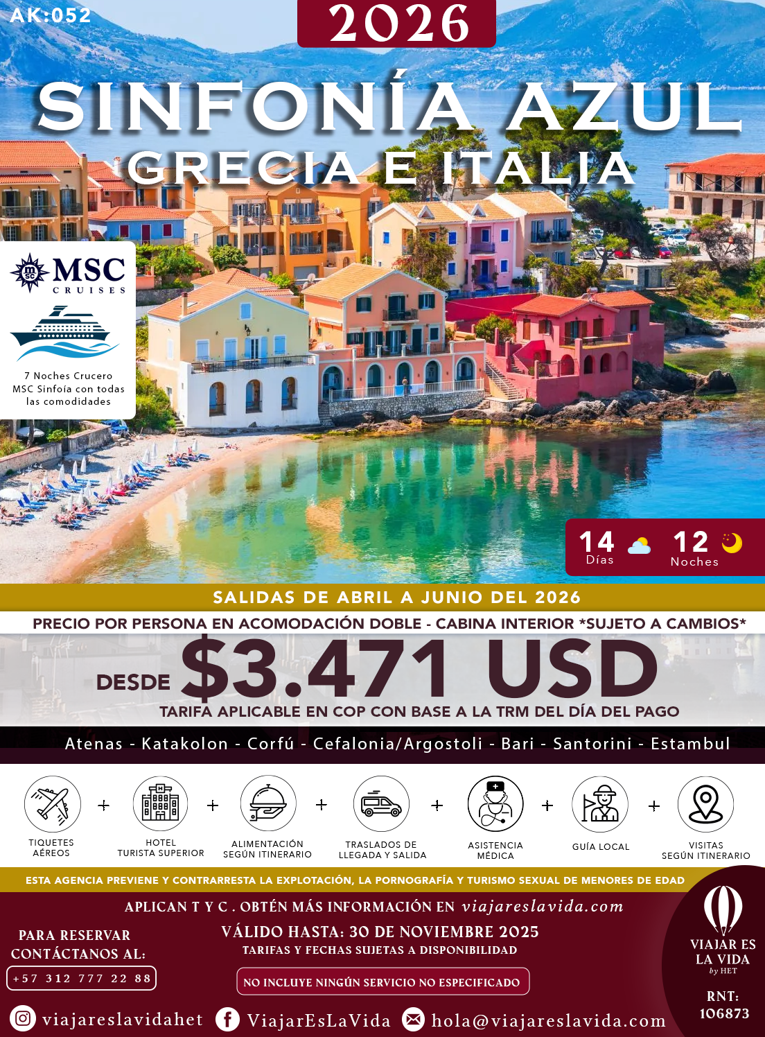 SINFONÍA AZUL: GRECIA E ITALIA CON CRUCERO 2026 AK052