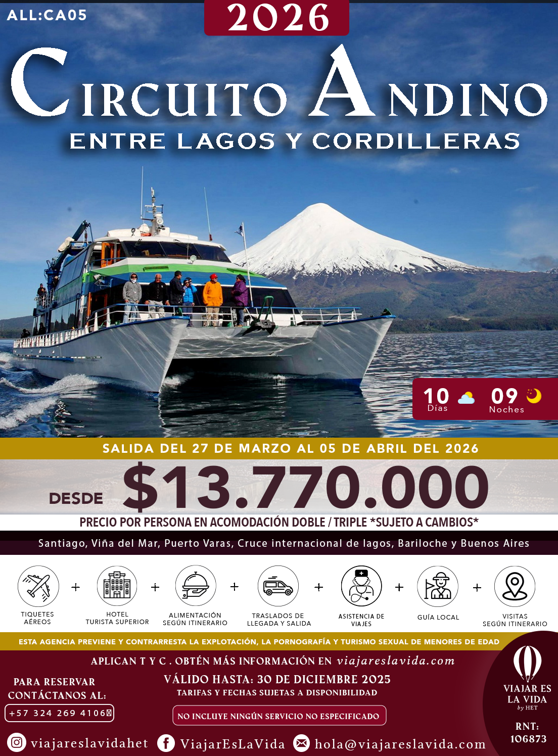 CIRCUITO ANDINO: ENTRE LAGOS Y CORDILLERAS SEMANA SANTA 2026 (14D 13N) ALL:CA05