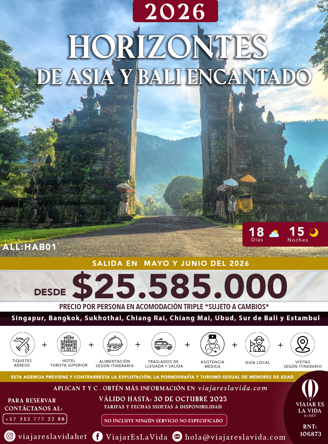 VIAJAR ES LA VIDA, con registro Nacional de Turismo No. 106873 como AGENCIA DE VIAJES MINORISTA, expedidas por el Ministerio de Comercio Industria y Turismo, está regulada por el régimen de responsabilidad que establece la ley 300/96, modificada por la Ley 1558 de 2012, Decreto 2438 de 2010, ley 1480 de 2011 referente al Estatuto del Consumidor y demás decretos reglamentarios, así como por las normas que las modifiquen o reemplacen. De igual manera, su responsabilidad está definida por las determinaciones propias que adopte al respecto, las cuales se enmarcan dentro de los límites y autorizaciones establecidas por la legislación vigente. Manifestamos que actuamos únicamente como intermediarios entre el viajero y las entidades o personas que prestan u operan los servicios de turismo anunciados que se indican en itinerarios, folletos o cualquier medio impreso, correspondiente a empresas de transporte, hoteles, restaurantes, etc. Por tanto, no tenemos injerencia en las decisiones o políticas de los mismos. Cualquier información adicional relativa a impuestos, condiciones, vigencias, tasas, cargos y demás pagos obligatorios deben ser consultados con el asesor de viajes, sitio web www.viajareslavida.com.