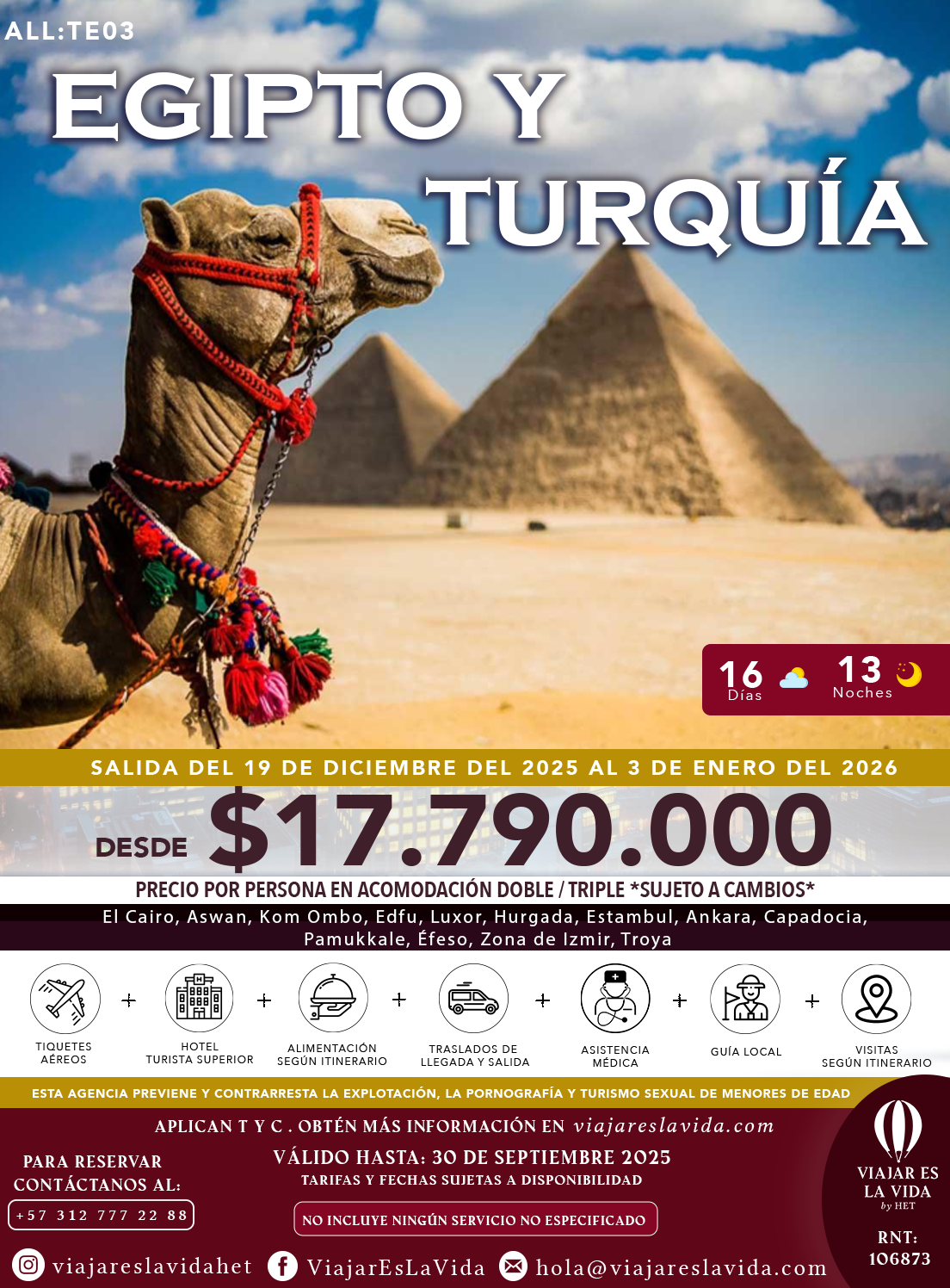 Incluye: Tiquetes aéreos con todos los impuestos – Visa de Egipto – alojamiento – crucero por El Nilo – excursiones con entradas incluidas – alimentación de acuerdo itinerario – tarjeta de asistencia médica con beneficio de cancelación