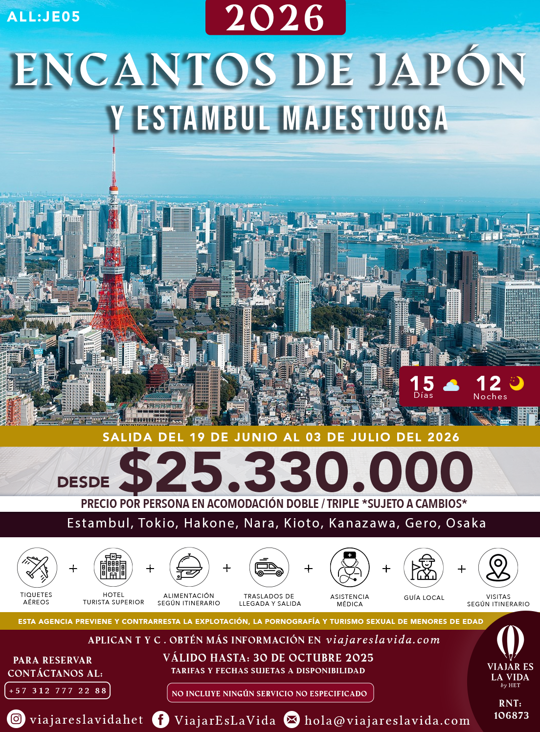 Incluye: Tiquetes aéreos con impuestos – trámite de la visa de Japón – alojamiento – excursiones – alimentación de acuerdo itinerario – tarjeta de asistencia médica con beneficio de cancelación