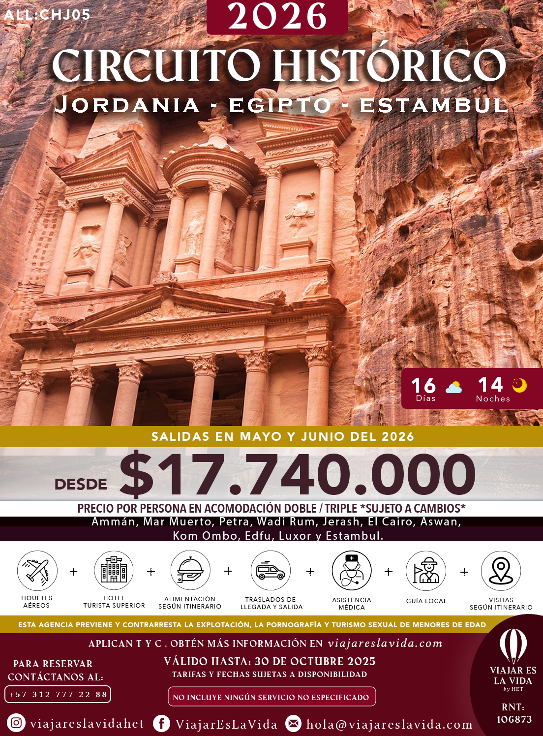 VIAJAR ES LA VIDA SAS. es propietario exclusivo de los derechos de autor de este material, cualquier reproducción, copia, venta, publicación o difusión sin su consentimiento, dará lugar al inicio de las acciones judiciales o administrativas que correspondan.