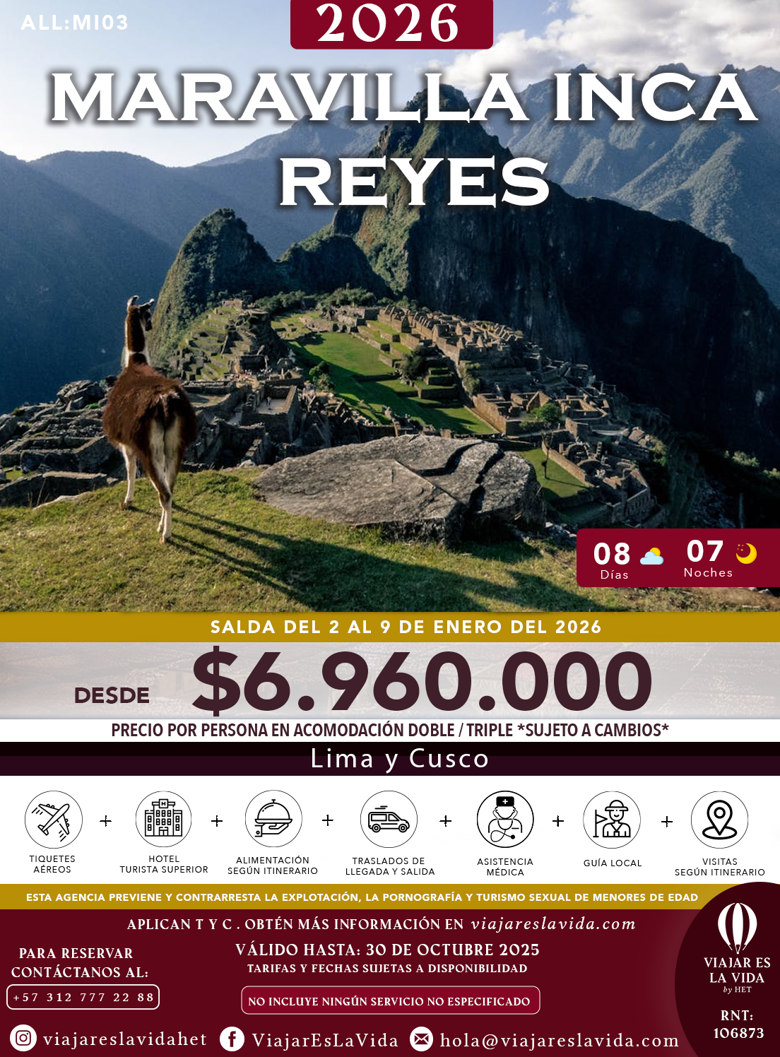 VIAJAR ES LA VIDA con registro Nacional de Turismo No. 106873 como AGENCIA DE VIAJES MINORISTA, expedidas por el Ministerio de Comercio Industria y Turismo, está regulada por el régimen de responsabilidad que establece la ley 300/96, modificada por la Ley 1558 de 2012, Decreto 2438 de 2010, ley 1480 de 2011 referente al Estatuto del Consumidor y demás decretos reglamentarios, así como por las normas que las modifiquen o reemplacen. De igual manera, su responsabilidad está definida por las determinaciones propias que adopte al respecto, las cuales se enmarcan dentro de los límites y autorizaciones establecidas por la legislación vigente. Manifestamos que actuamos únicamente como intermediarios entre el viajero y las entidades o personas que prestan u operan los servicios de turismo anunciados que se indican en itinerarios, folletos o cualquier medio impreso, correspondiente a empresas de transporte, hoteles, restaurantes, etc. Por tanto, no tenemos injerencia en las decisiones o políticas de los mismos. Cualquier información adicional relativa a impuestos, condiciones, vigencias, tasas, cargos y demás pagos obligatorios deben ser consultados con el asesor de viajes, sitio web www.www.viajareslavida.com.