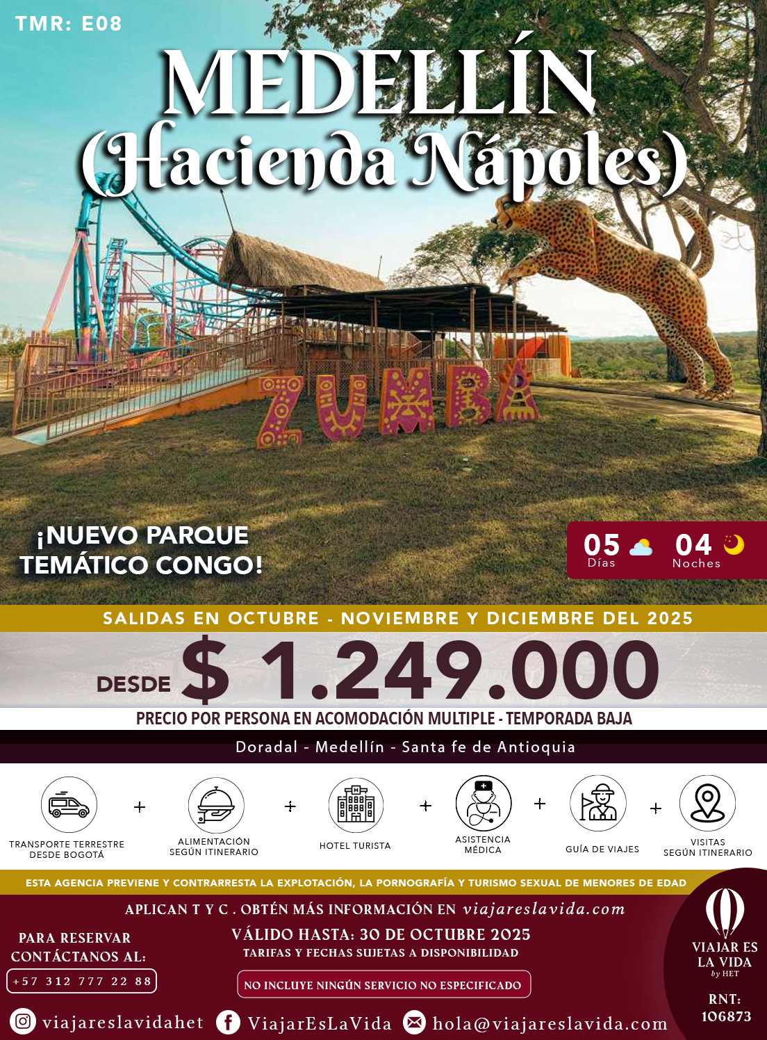 Favor leer cuidadosamente el siguiente documento, mediante el cual ejerce su derecho y deber de conocer los términos generales de su viaje (servicios, paquetes turísticos, transporte, manejo del equipaje, objetos personales, asistencia y cláusulas de responsabilidad), a las que adquiere usted como viajero; así como acepta haber sido informado y por consiguiente adquiere nuestros servicios turísticos. En primer término, aclaramos que la Agencia de VIAJES VIAJAR ES LA VIDA SAS está sujeta al régimen de responsabilidad que establece la Ley 1558 del 2012, el Decreto 2438 del 2010 y demás decretos reglamentarios. La Agencia de Viajes VIAJAR ES LA VIDA presta servicios de paquetes turísticos para el viajero que incluyen transporte, alimentación, visitas, alojamiento y etc. Sin embargo, VIAJAR ES LA VIDA se responsabiliza de forma limitada ante los viajeros por cada uno de los servicios ofrecidos en el programa. VIAJAR ES LA VIDA siendo identificado como el operador de cada plan turístico tiene la responsabilidad de velar por el bienestar de los pasajeros y el cumplimiento de todos los servicios ofrecidos, así como de brindar la asistencia necesaria (dudas, orientaciones, horarios, etc.) a cada uno de los pasajeros. VIAJAR ES LA VIDA se compromete a velar por la calidad de los servicios prestados con cada uno de nuestros pasajeros. INFORMACIÓN DEL VIAJE: VIAJAR ES LA VIDA ofrecerá en todos los viajes una reunión de despedida donde se encuentran todos los viajeros, ofreciendo la información necesaria y las recomendaciones para tener en cuenta en su viaje. La fecha de la reunión es el mismo día de la salida en el punto de encuentro y el lugar se informará un día antes de la fecha de salida del viaje. Es responsabilidad del pasajero leer cuidadosamente las recomendaciones para ejercer su derecho y deber de estar informado de cada detalle de su viaje. SALIDAS: VIAJAR ES LA VIDA maneja salidas familiares y / o grupales, el pasajero debe tener en cuenta que las salidas grupales se logran con un mínimo de personas y al no completar esa cantidad mínima VIAJAR ES LA VIDA está en facultad de hacer modificaciones sobre el viaje, poniendo por supuesto como prioridad la comodidad y tranquilidad de cada uno de los pasajeros. Es importante tener en cuenta que, en caso de no completar el mínimo de personas para efectuar la salida, las condiciones de viaje pueden cambiar ya que se puede realizar el servicio privado o cambio de destino, en caso de ser así se informara con antelación al pasajero las nuevas condiciones y precios del programa y en caso de aceptar dichos cambios estos costos son responsabilidad del pasajero. ACOMPAÑAMIENTO: Todas las salidas que maneja VIAJAR ES LA VIDA tiene acompañamiento de un Guía turístico, Coordinador de Viajes y/o Conductor desde Bogotá D.C., y durante todo el recorrido; sin embargo, el pasajero debe tener en cuenta que dicho acompañante no se hace responsable por objetos personales, de valor o dinero de ningún pasajero. En caso de que el Guía turístico, Coordinador de Viajes y/o Conductor por su propia voluntad acceda a guardar dichos objetos es 100% responsabilidad del Guía turístico, Coordinador de Viajes y/o Conductor y VIAJAR ES LA VIDA no se hace responsable por daños o perdidas de ningún tipo, ni objetos dejados en el transporte y/u hoteles. SERVICIOS ADICIONALES: Algunos receptivos y/o servicios adicionales pueden ser adquiridos directamente en la agencia el día de salida del tour el cual tendrá un precio establecido de forma estimada dentro del programa, siempre y cuando se pertenezca a una salida de grupo, de lo contrario VIAJAR ES LA VIDA recomienda adquirir el servicio deseado directamente en el destino. NOTA: Tenga en cuenta que al adquirir el opcional en el lugar de destino los precios pueden variar y VIAJAR ES LA VIDA no garantiza un precio estándar. EQUIPAJE: El pasajero es el ÚNICO responsable por el manejo de sus objetos personales, dinero, objetos de valor, documentación personal, aparatos electrónicos que lleve durante el viaje. Debe tener en cuenta que durante todo el recorrido están bajo su custodia, por lo cual VIAJAR ES LA VIDA no se hace responsable en ninguna circunstancia por perdidas, hurtos, olvidos en hoteles, en lugares de visita, parques y/o buses, vans o cualquier medio de transporte etc. ALOJAMIENTO: Los servicios prestados por los hoteles están determinados según la categoría turística correspondiente y se entiende que el pasajero ha sido informado y acepta las condiciones de alojamiento brindadas en el programa seleccionado. En cualquier caso, de salidas grupales, estos deben tener en cuenta que internacionalmente se maneja el check-in a las 03:00 pm y el check-out a las 12:00 pm del día para evitar sobrecostos e inconvenientes. La acomodación según todos nuestros planes turísticos puede ser doble, triple, cuádruple o quíntuple; en caso de preferir acomodación sencilla debe consultar con uno de nuestros asesores el valor adicional que aumenta la misma el cual deberá ser asumido por el cliente. TARJETA DE ASISTENCIA AL VIAJERO: Es disposición general que cualquier viajero este amparado por una asistencia médica es por esto por lo que VIAJAR ES LA VIDA incluye en todos sus planes turísticos la tarjeta de asistencia médica que cubre: Asistencia médica por accidente o por enfermedad, asistencia en hotel por accidente o enfermedad, remuneración por robo de documentos (Hurto Calificado) no completo, etc., todo esto que llegue a ocurrir durante el viaje adquirido. Es obligación de todo pasajero tomar la tarjeta de asistencia médica que brinda VIAJAR ES LA VIDA de lo contrario no se le permitirá adquirir un plan turístico. CONDICIONES DE LOS PROGRAMAS: 1. Es responsabilidad y obligación del cliente leer cuidadosamente los servicios que incluye y No Incluye el valor del plan turístico. Los impuestos y tarifas administrativas generalmente están incluidos en el precio del programa