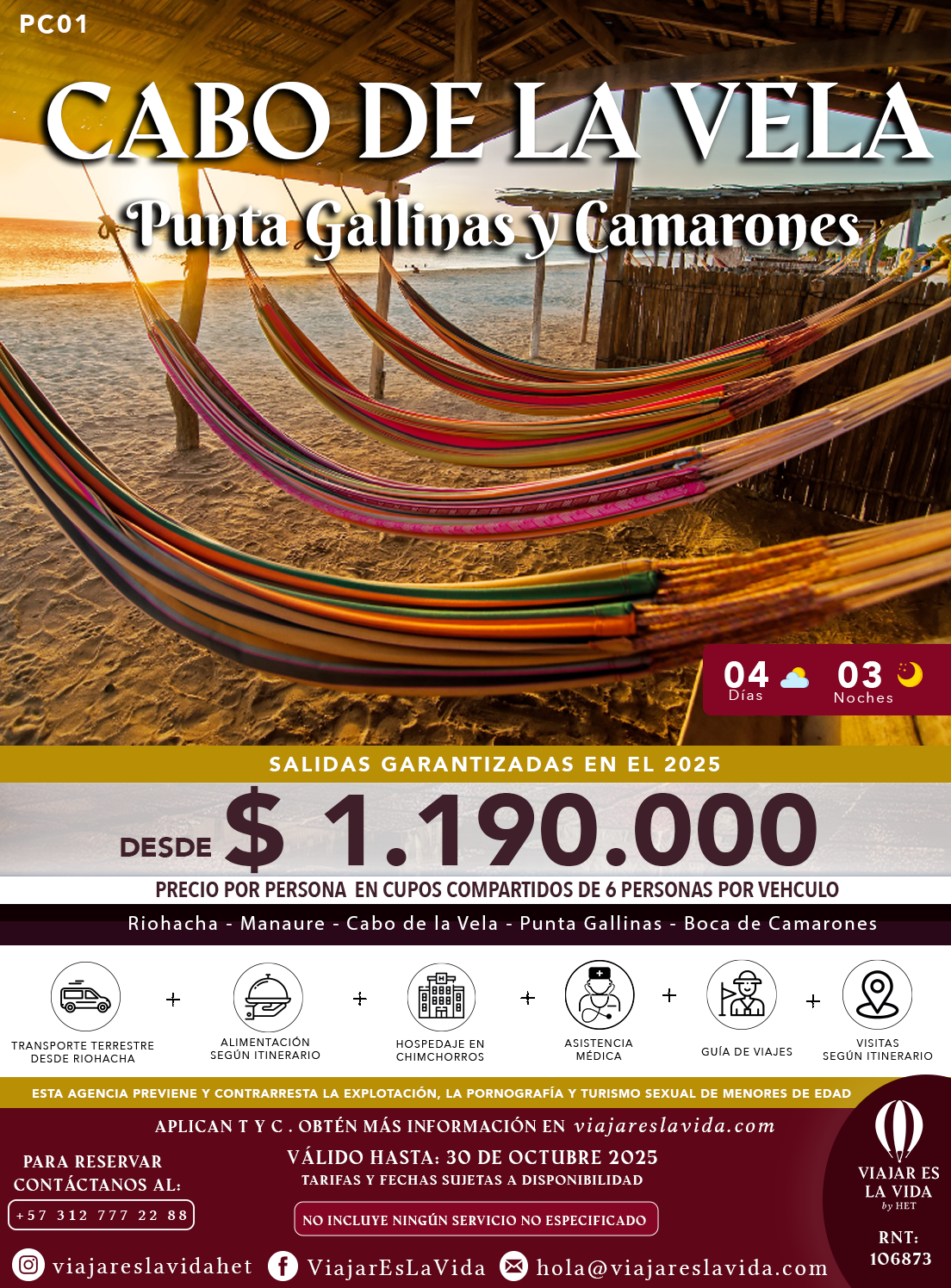 El objetivo de la actividad turística se puede ver afectado por factores climáticos, por lo tanto, VIAJAR ES LA VIDA con registro Nacional de Turismo No. 106873 como AGENCIA DE VIAJES MINORISTA no se hace responsable por el resultado.