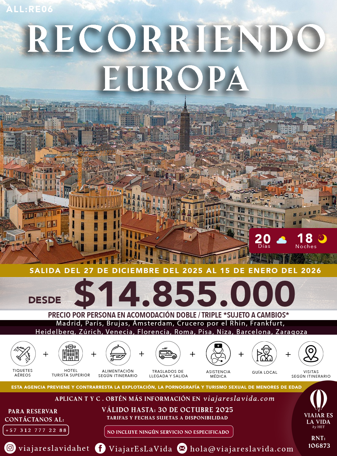 VIAJAR ES LA VIDA, con registro Nacional de Turismo No. 106873 como AGENCIA DE VIAJES MINORISTA, expedidas por el Ministerio de Comercio Industria y Turismo, está regulada por el régimen de responsabilidad que establece la ley 300/96, modificada por la Ley 1558 de 2012, Decreto 2438 de 2010, ley 1480 de 2011 referente al Estatuto del Consumidor y demás decretos reglamentarios, así como por las normas que las modifiquen o reemplacen. De igual manera, su responsabilidad está definida por las determinaciones propias que adopte al respecto, las cuales se enmarcan dentro de los límites y autorizaciones establecidas por la legislación vigente. Manifestamos que actuamos únicamente como intermediarios entre el viajero y las entidades o personas que prestan u operan los servicios de turismo anunciados que se indican en itinerarios, folletos o cualquier medio impreso, correspondiente a empresas de transporte, hoteles, restaurantes, etc. Por tanto, no tenemos injerencia en las decisiones o políticas de los mismos. Cualquier información adicional relativa a impuestos, condiciones, vigencias, tasas, cargos y demás pagos obligatorios deben ser consultados con el asesor de viajes, sitio web www.viajareslavida.com o sitio web www.viajareslavida.com.
