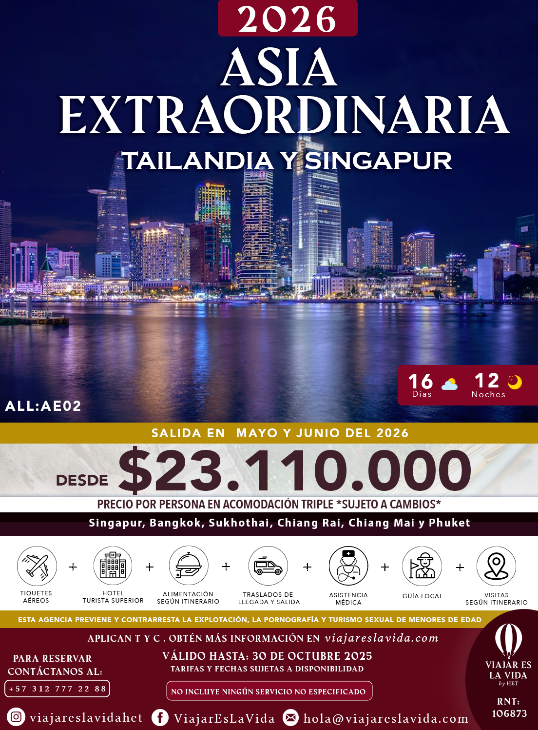 VIAJAR ES LA VIDA, con registro Nacional de Turismo No. 106873 como AGENCIA DE VIAJES MINORISTA, expedidas por el Ministerio de Comercio Industria y Turismo, está regulada por el régimen de responsabilidad que establece la ley 300/96, modificada por la Ley 1558 de 2012, Decreto 2438 de 2010, ley 1480 de 2011 referente al Estatuto del Consumidor y demás decretos reglamentarios, así como por las normas que las modifiquen o reemplacen. De igual manera, su responsabilidad está definida por las determinaciones propias que adopte al respecto, las cuales se enmarcan dentro de los límites y autorizaciones establecidas por la legislación vigente. Manifestamos que actuamos únicamente como intermediarios entre el viajero y las entidades o personas que prestan u operan los servicios de turismo anunciados que se indican en itinerarios, folletos o cualquier medio impreso, correspondiente a empresas de transporte, hoteles, restaurantes, etc. Por tanto, no tenemos injerencia en las decisiones o políticas de los mismos. Cualquier información adicional relativa a impuestos, condiciones, vigencias, tasas, cargos y demás pagos obligatorios deben ser consultados con el asesor de viajes, sitio web www.viajareslavida.com.