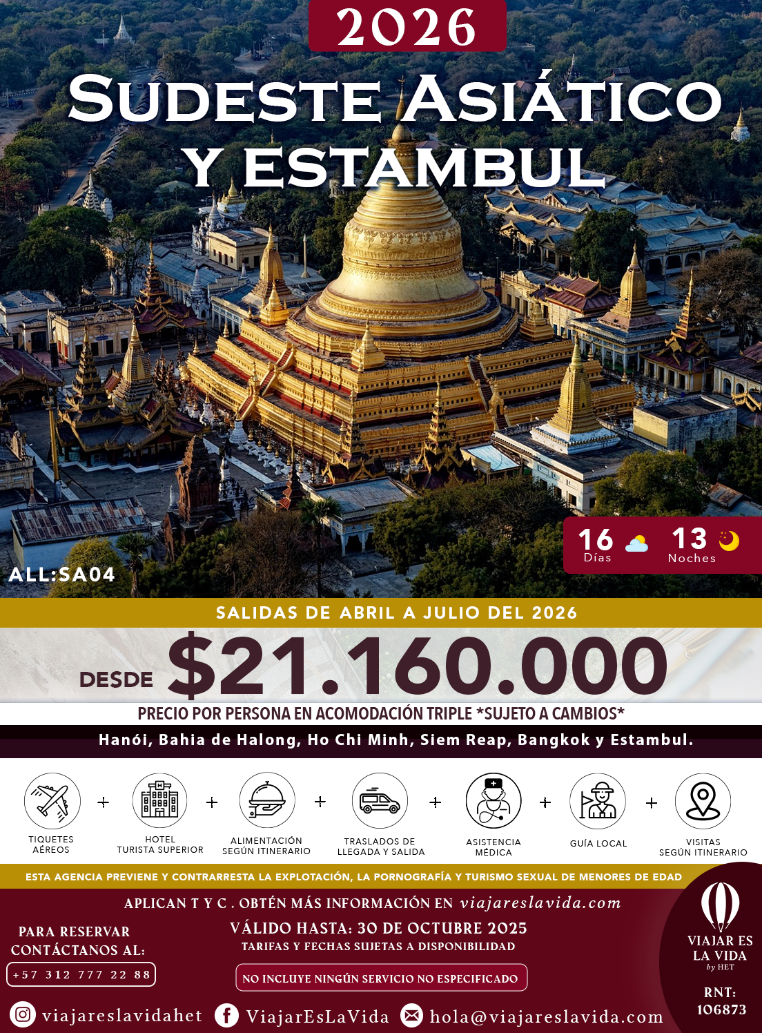 VIAJAR ES LA VIDA, con registro Nacional de Turismo No. 106873 como AGENCIA DE VIAJES MINORISTA, expedidas por el Ministerio de Comercio Industria y Turismo, está regulada por el régimen de responsabilidad que establece la ley 300/96, modificada por la Ley 1558 de 2012, Decreto 2438 de 2010, ley 1480 de 2011 referente al Estatuto del Consumidor y demás decretos reglamentarios, así como por las normas que las modifiquen o reemplacen. De igual manera, su responsabilidad está definida por las determinaciones propias que adopte al respecto, las cuales se enmarcan dentro de los límites y autorizaciones establecidas por la legislación vigente. Manifestamos que actuamos únicamente como intermediarios entre el viajero y las entidades o personas que prestan u operan los servicios de turismo anunciados que se indican en itinerarios, folletos o cualquier medio impreso, correspondiente a empresas de transporte, hoteles, restaurantes, etc. Por tanto, no tenemos injerencia en las decisiones o políticas de los mismos. Cualquier información adicional relativa a impuestos, condiciones, vigencias, tasas, cargos y demás pagos obligatorios deben ser consultados con el asesor de viajes, sitio web www.viajareslavida.com.