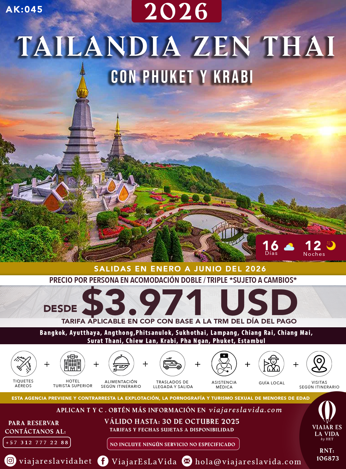 Visitaremos: Hermosas y exóticas islas, templos budistas, vestigios de las dinastías más importantes del reino de Siam, El Triángulo de Oro, La famosa ciudad de Phuket, las hermosas islas Phi Phi, un santuario de elefantes y las mujeres jirafa