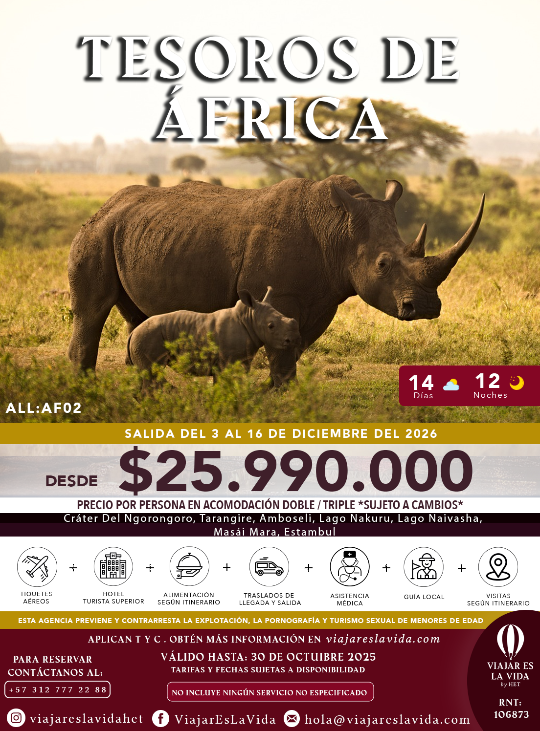 Incluye: Tiquetes aéreos con todos los impuestos – Visa de Tanzania y de Kenia – alojamiento – excursiones – alimentación de acuerdo itinerario – tarjeta de asistencia médica con beneficio de cancelación