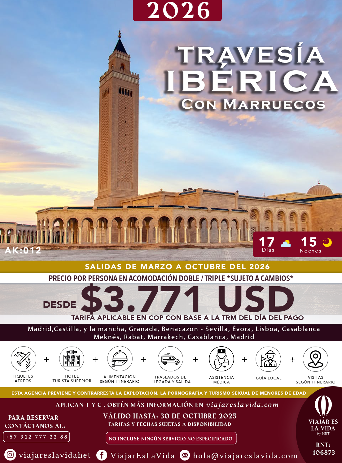 27 marzo al 12 abril de 2026 22 mayo al 07 junio de 2026 26 junio al 12 julio de 2026 03 julio al 19 julio de 2026 | USD 3.771 | USD 4.771 | USD 3.171 |