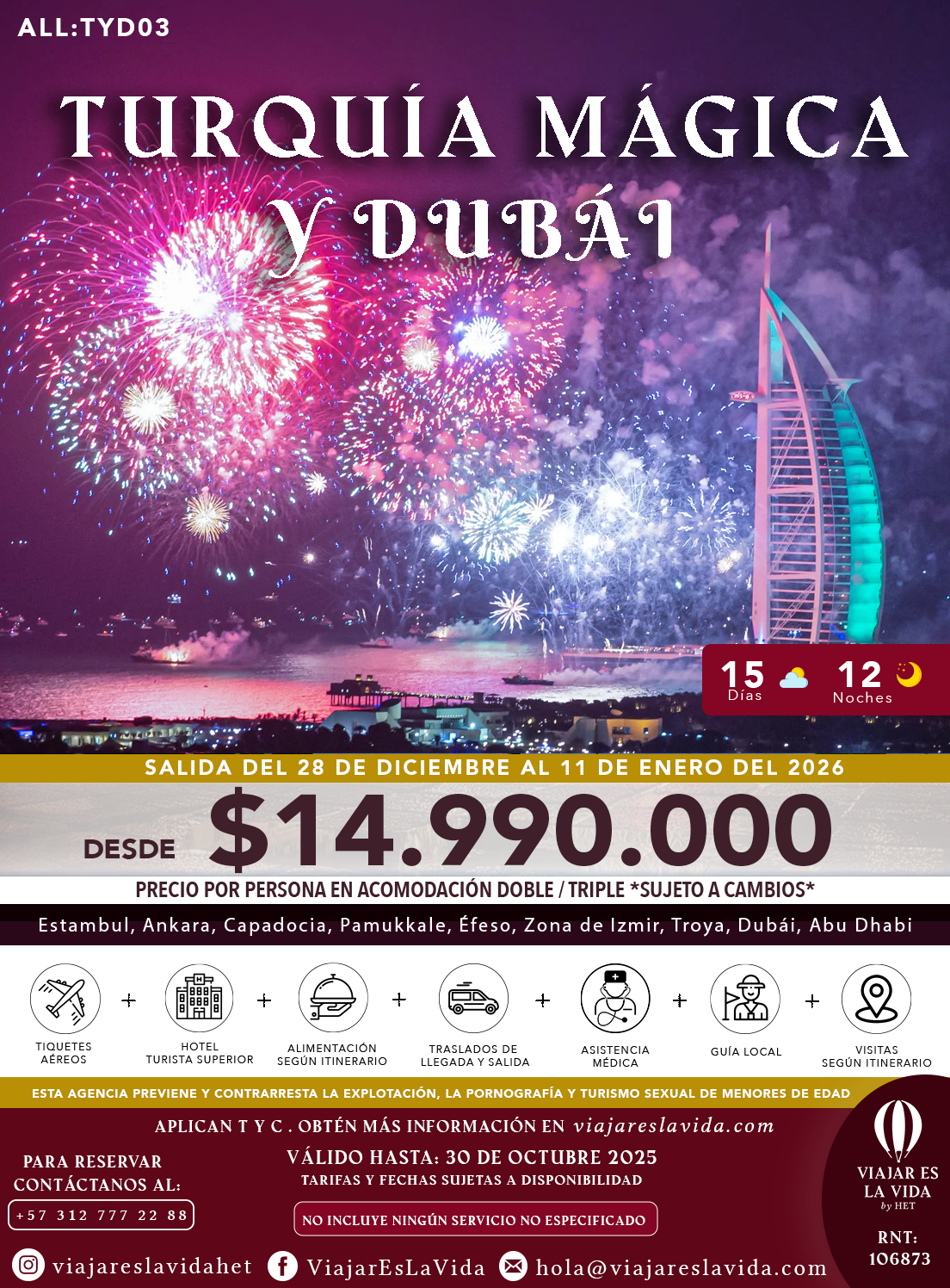 Los impuestos, tasas y contribuciones que afecten las tarifas aéreas, hoteleras y demás servicios ofrecidos por VIAJAR ES LA VIDA pueden sufrir variación en cualquier momento por decisión de los prestadores de servicios involucrados en los itinerarios o en los servicios ofrecidos. Los valores y tarifas presentadas en las cotizaciones, manuales o sitio web www.viajareslavida.com están sujetos a cambio, disponibilidad y realización de grandes eventos en los destinos. Los precios o valores hoteleros están sujetos a su ubicación, categoría, servicios y ofertas en el momento de realizar la reserva.