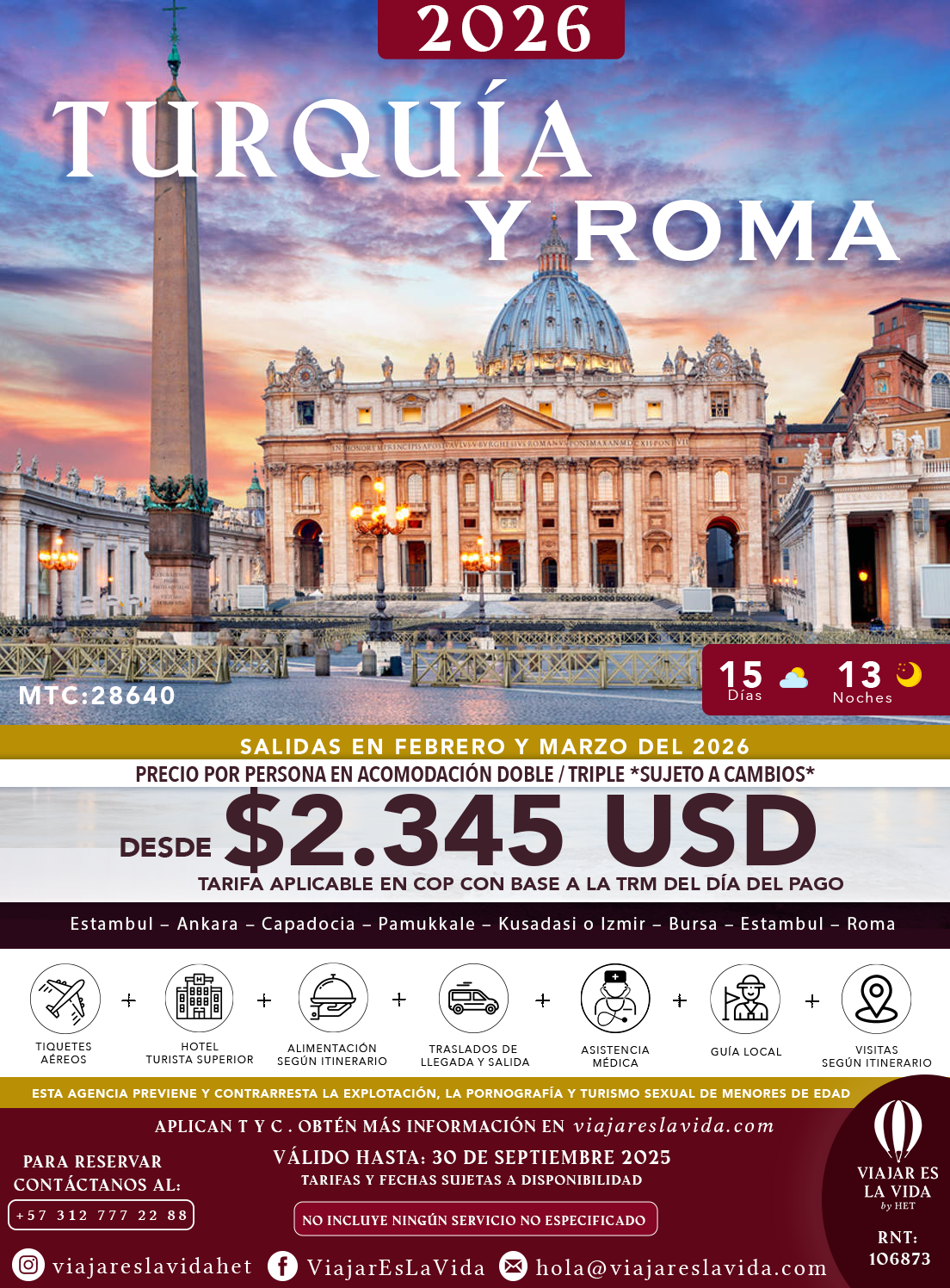 TARIFA: Nuestros programas son calculados a un tipo de cambio promedio del año vigente entre el peso colombiano frente al dólar y al euro; en caso de existir una fluctuación importante al alza, este ajuste será notificado vía correo electrónico por su asesor de venta. ***Estos precios aplican para pagos en efectivo o transferencia al cambio de la trm del día del pago En caso de alza en la tasa e impuestos de la tarifa aérea; lo cual es política de la aerolínea y/o impuestos hoteleros, tasas o contribuciones gubernamentales, aun existiendo pago parcial o total esta diferencia deberá ser asumida por el pasajero para la prestación del servicio. | |||