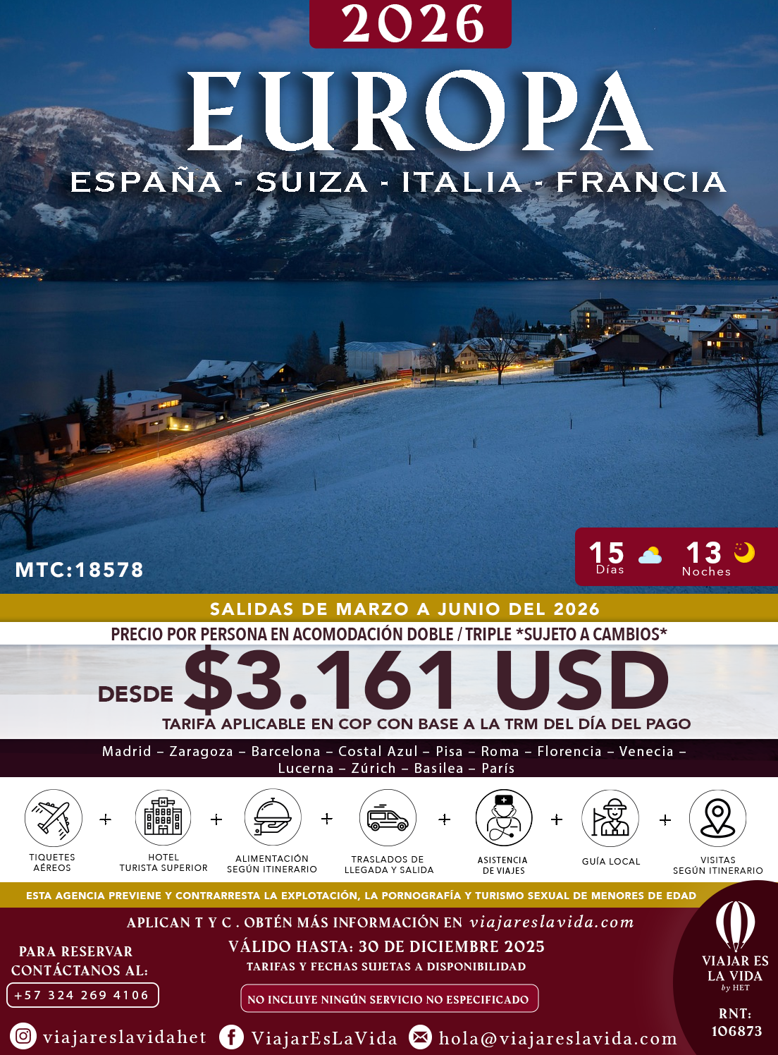 EUROPA: ESPAÑA, SUIZA, ITALIA Y FRANCIA MARZO A JUNIO 2026 MTC:18578