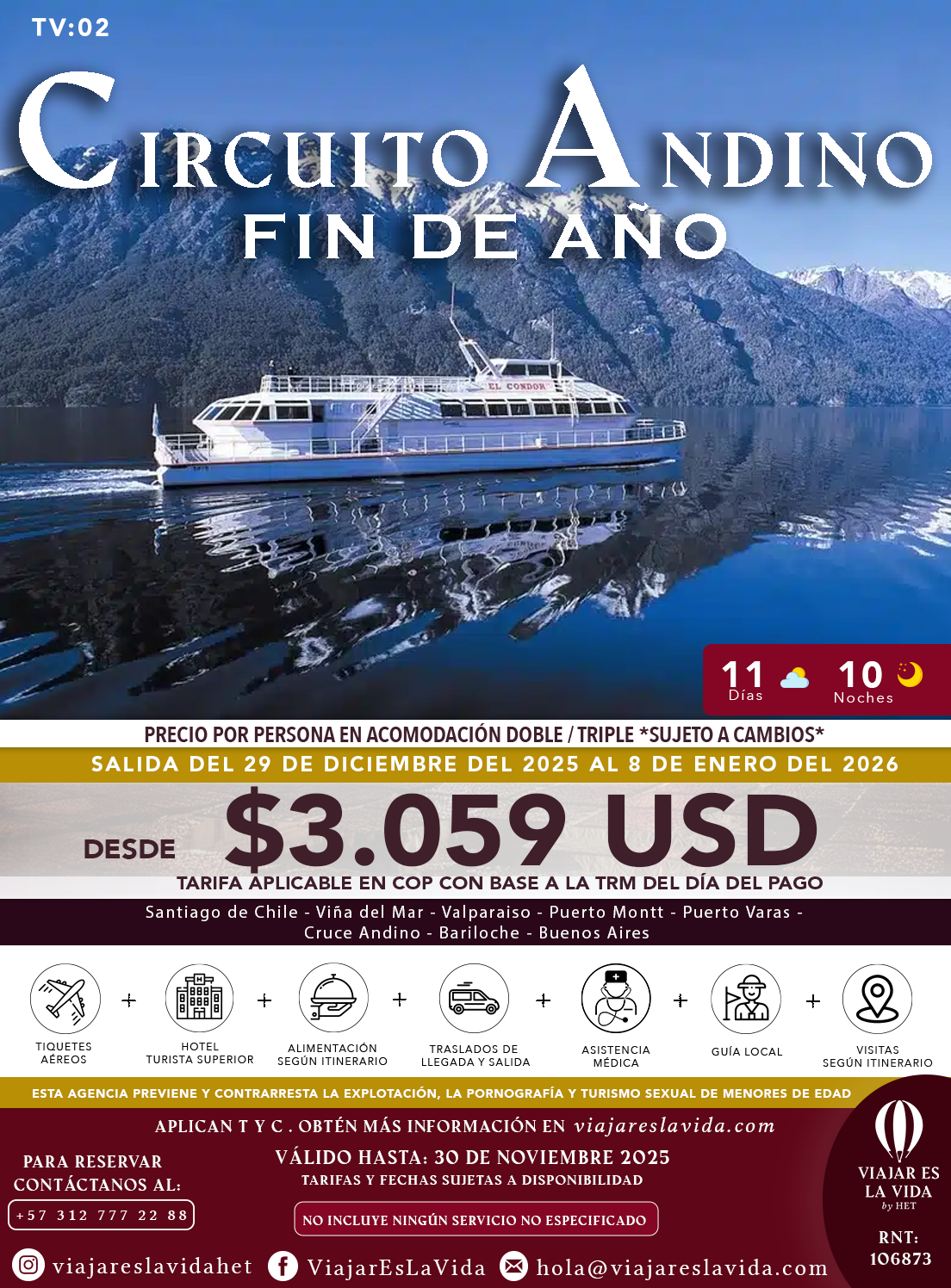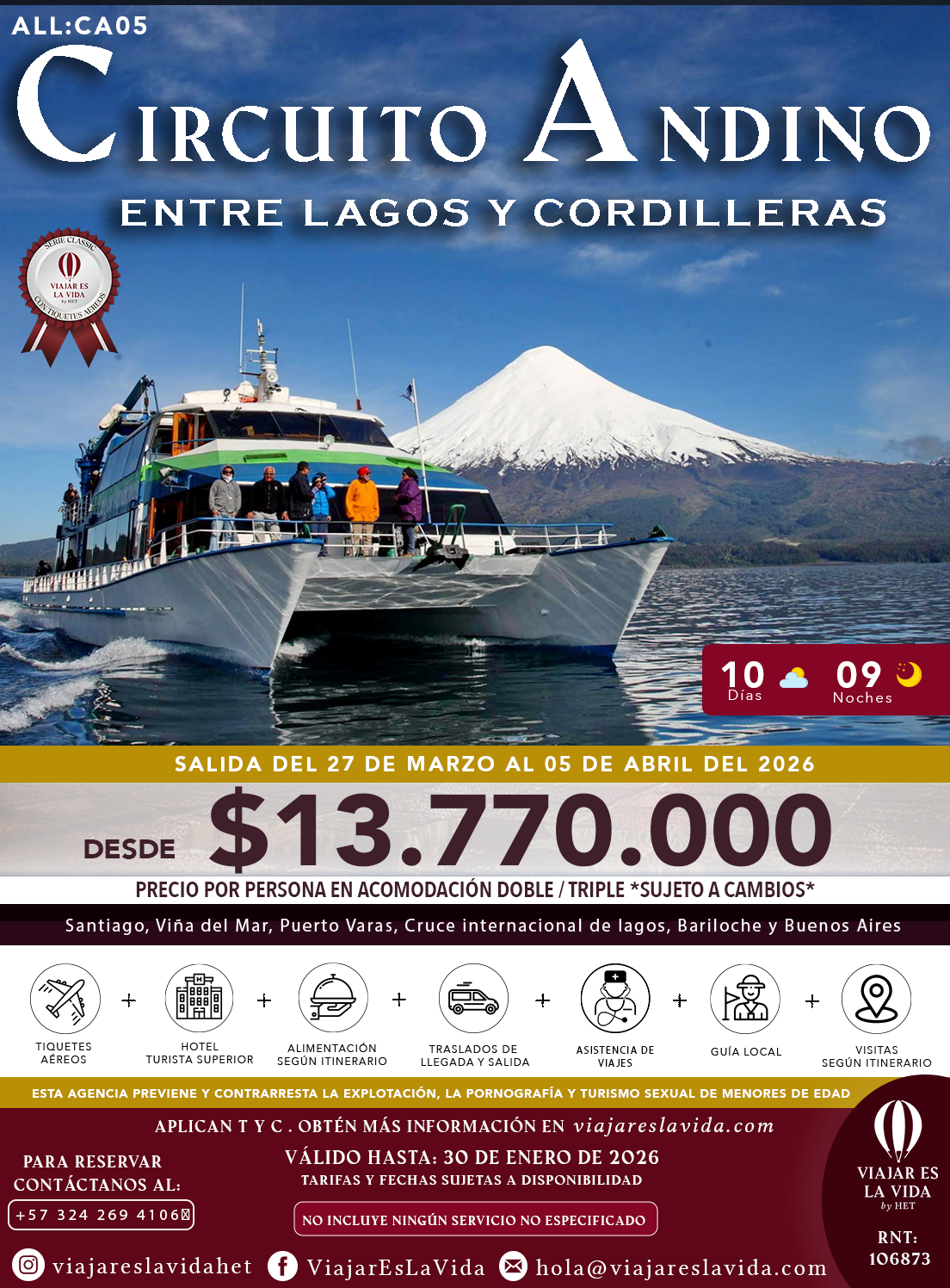 CIRCUITO ANDINO: ENTRE LAGOS Y CORDILLERAS SEMANA SANTA 2026 (14D 13N) ALL:CA05